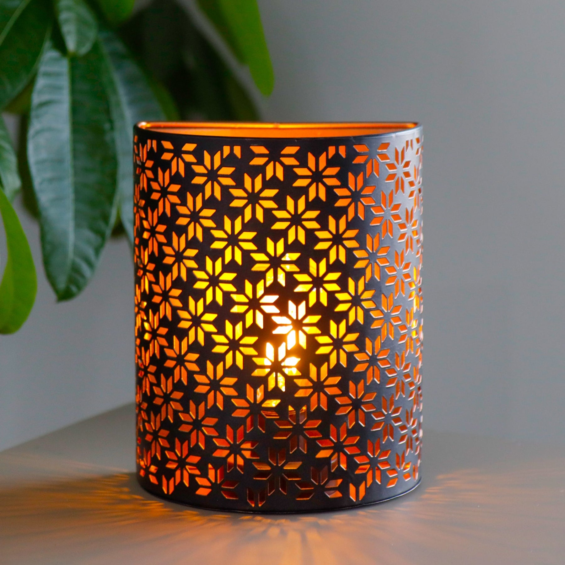 The lamp features a rustic metal design enriched with snowflake details, presenting a timeless charm and a festive touch to your décor.